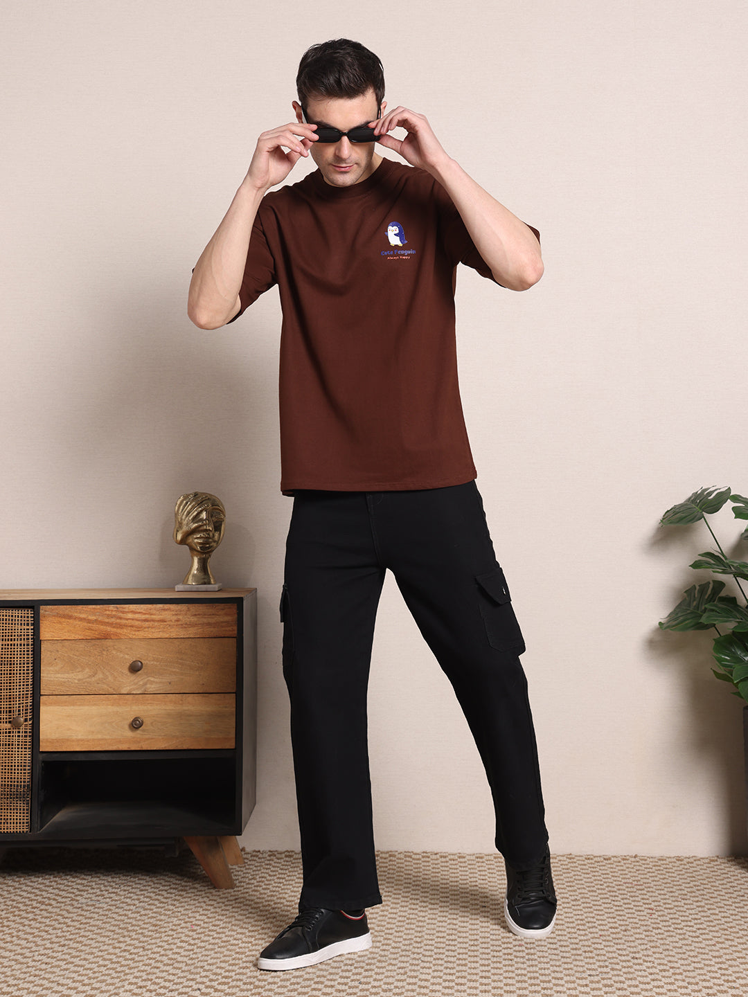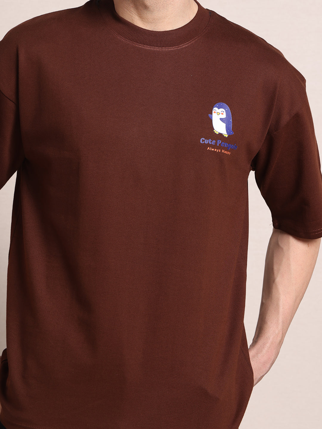 Men's Oversized French Terry Cotton T-Shirt – Chicory Coffee Brown with Cute Penguin Print