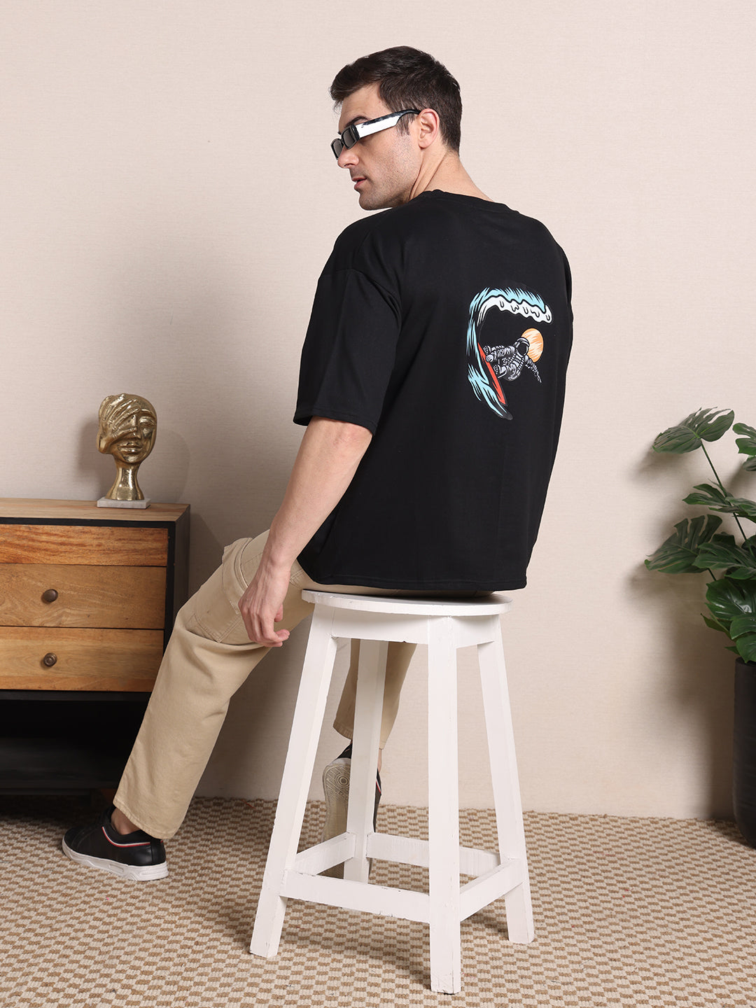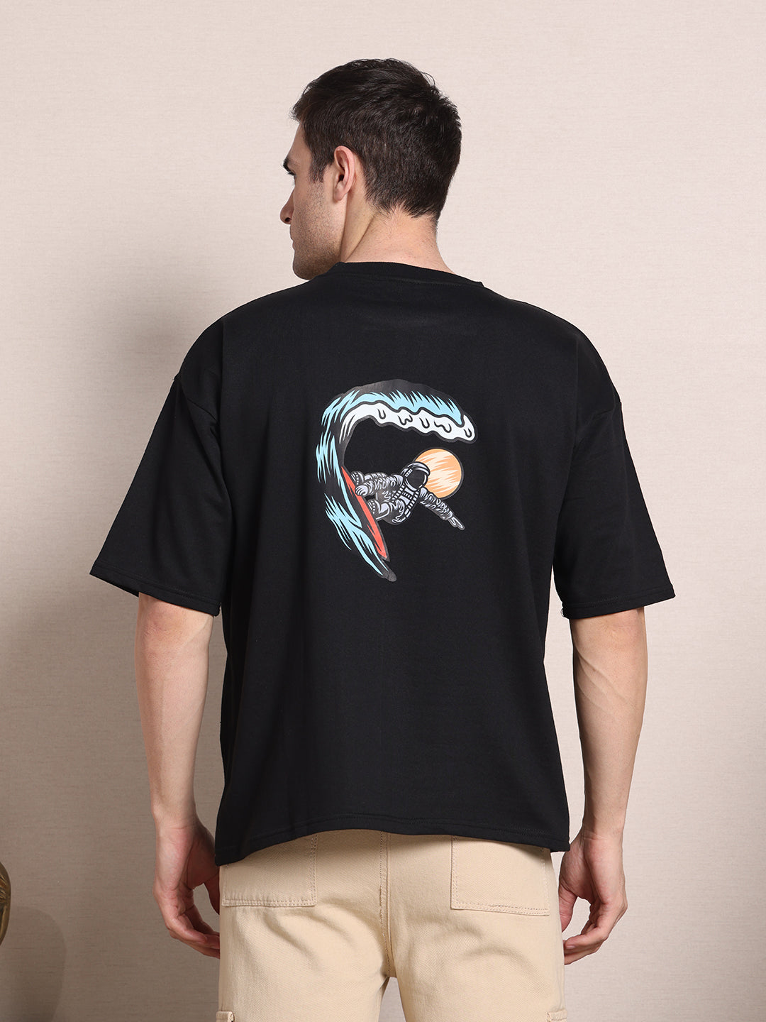 Men's Oversized T-Shirt – Black | Astronaut Wave Print | 240 GSM French Terry Cotton