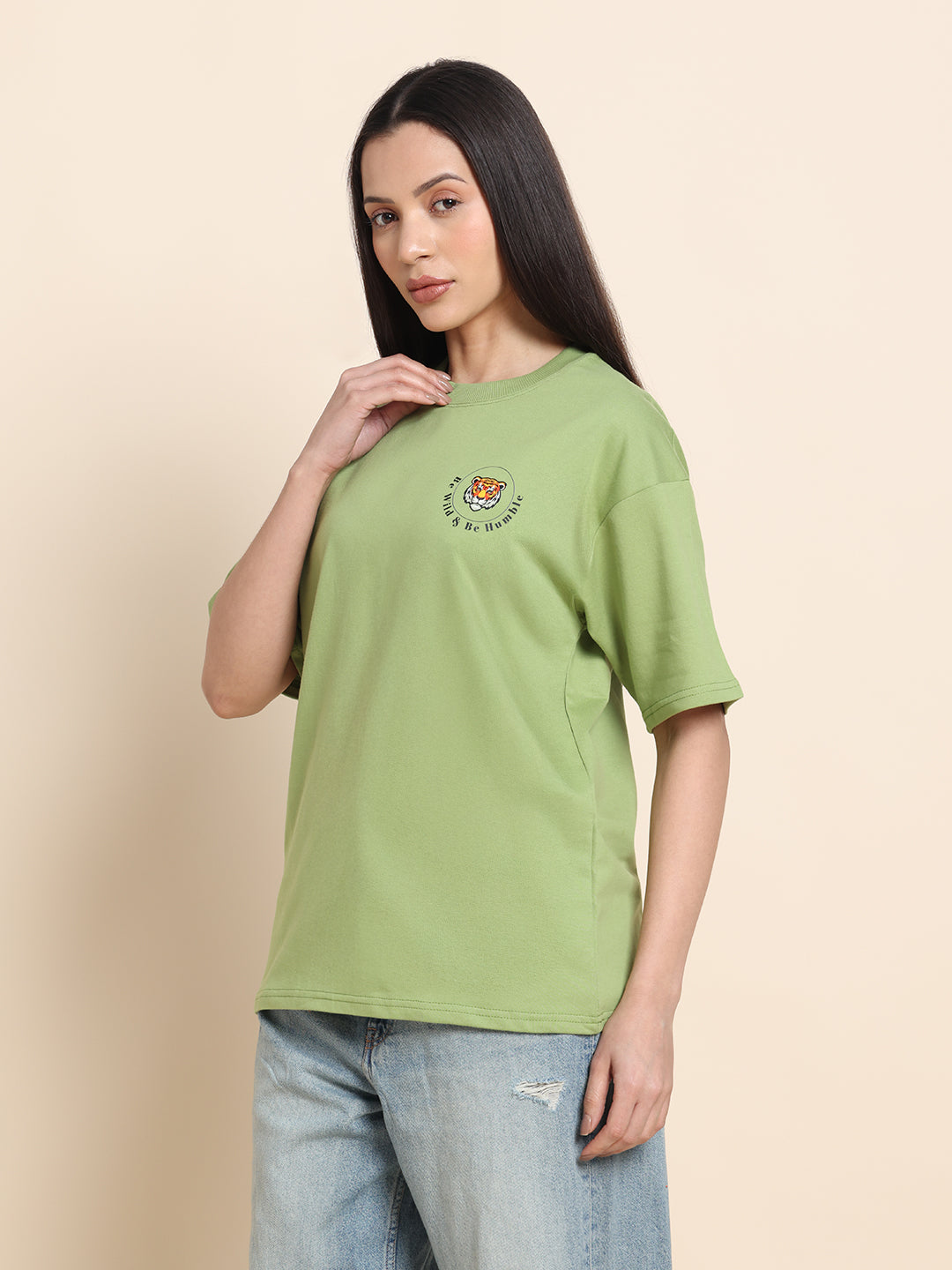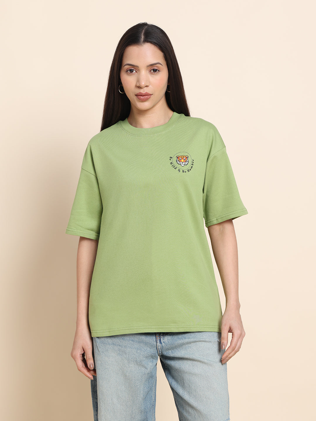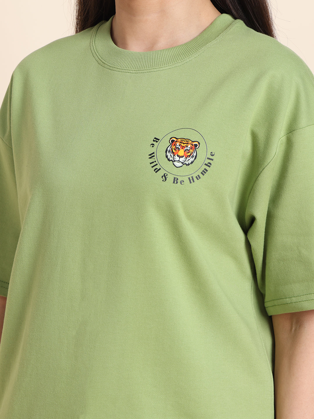 Unleash your bold and fearless style with this oversized French Terry cotton T-shirt in a stunning green shade. Crafted from premium 240 GSM fabric, this tee offers a perfect balance of comfort, durability, and breathability. The fierce tiger print with the empowering phrase "Be Wild & Be Humble" makes this a statement piece for those who love fashion with meaning.
