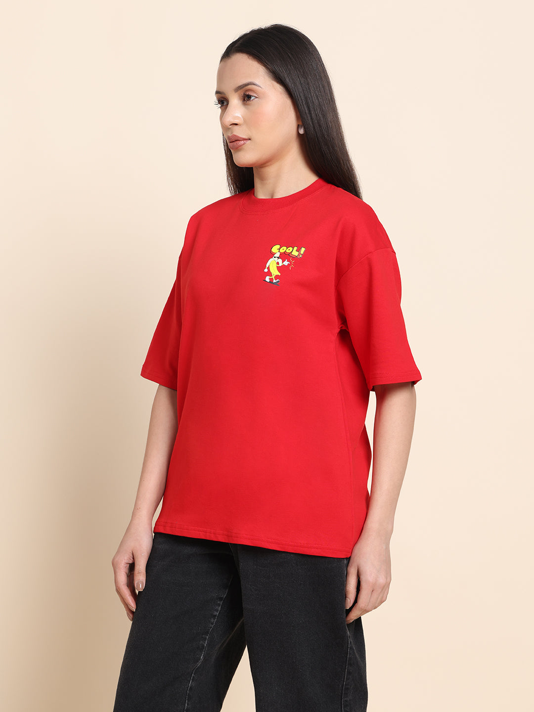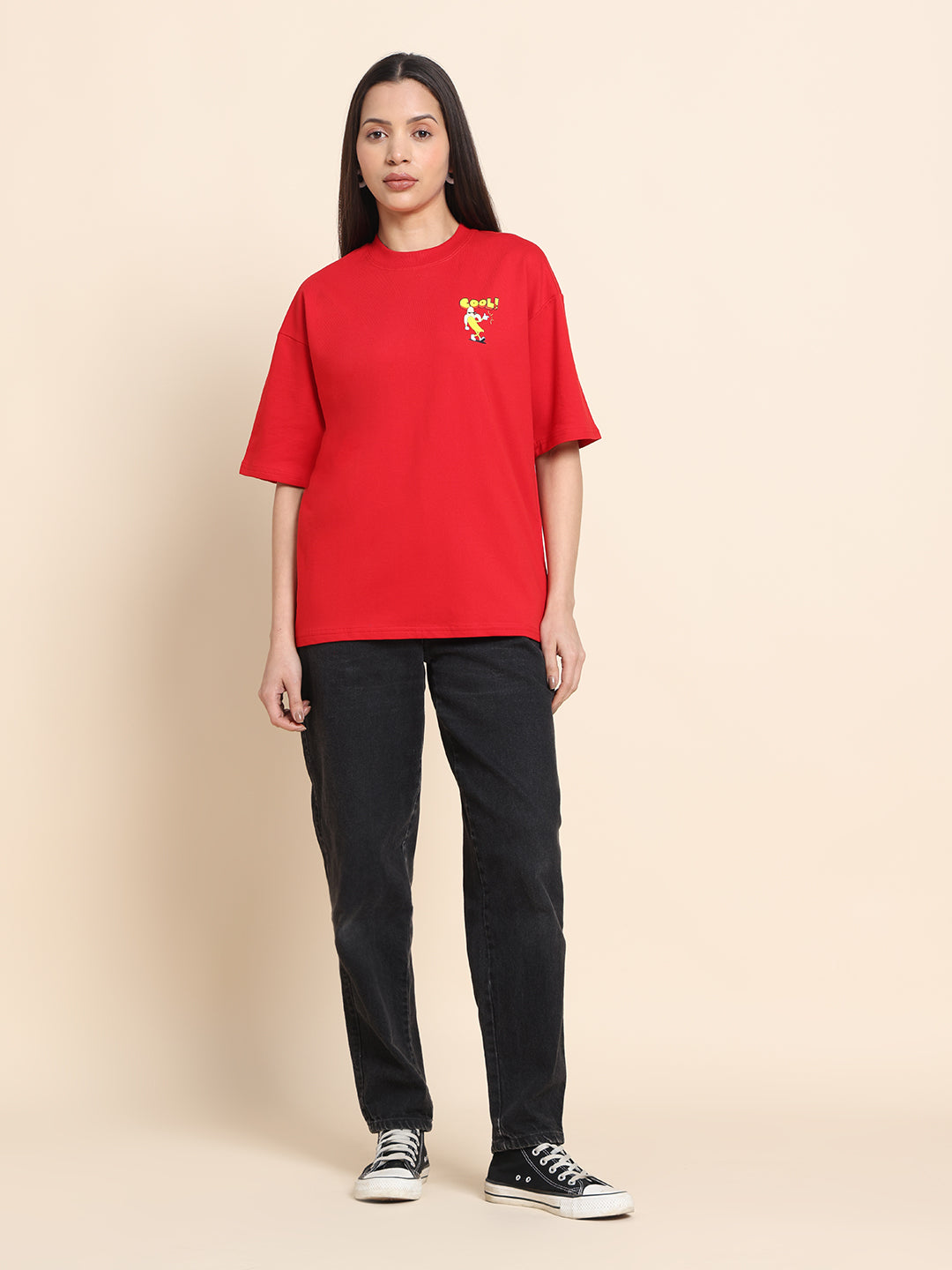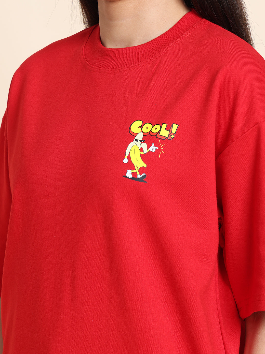 Stay effortlessly stylish and comfortable with this oversized French Terry cotton T-shirt for women. Designed for a relaxed fit, this bold red tee features a trendy "COOL!" print with a quirky banana graphic, adding a playful touch to your wardrobe.