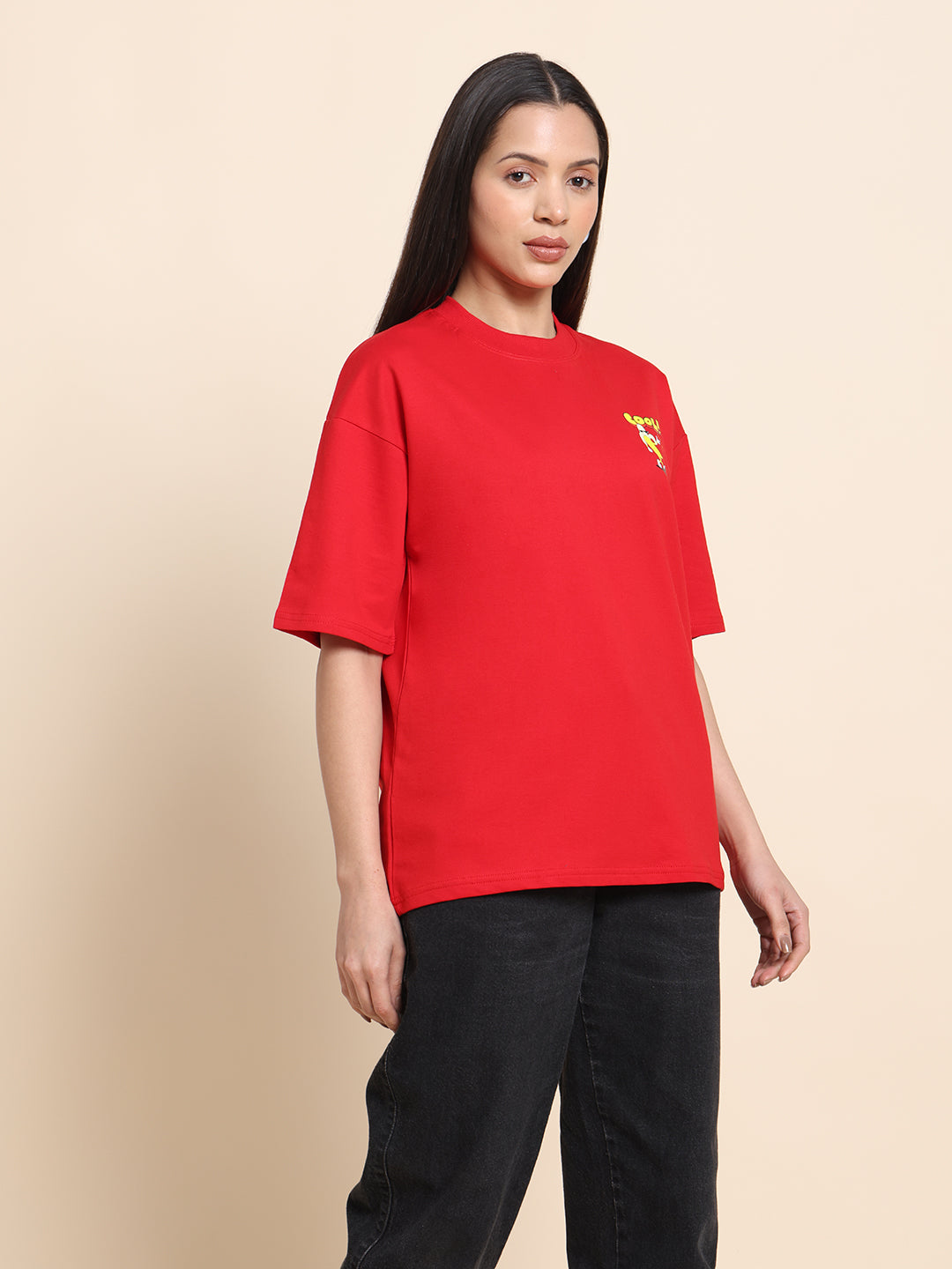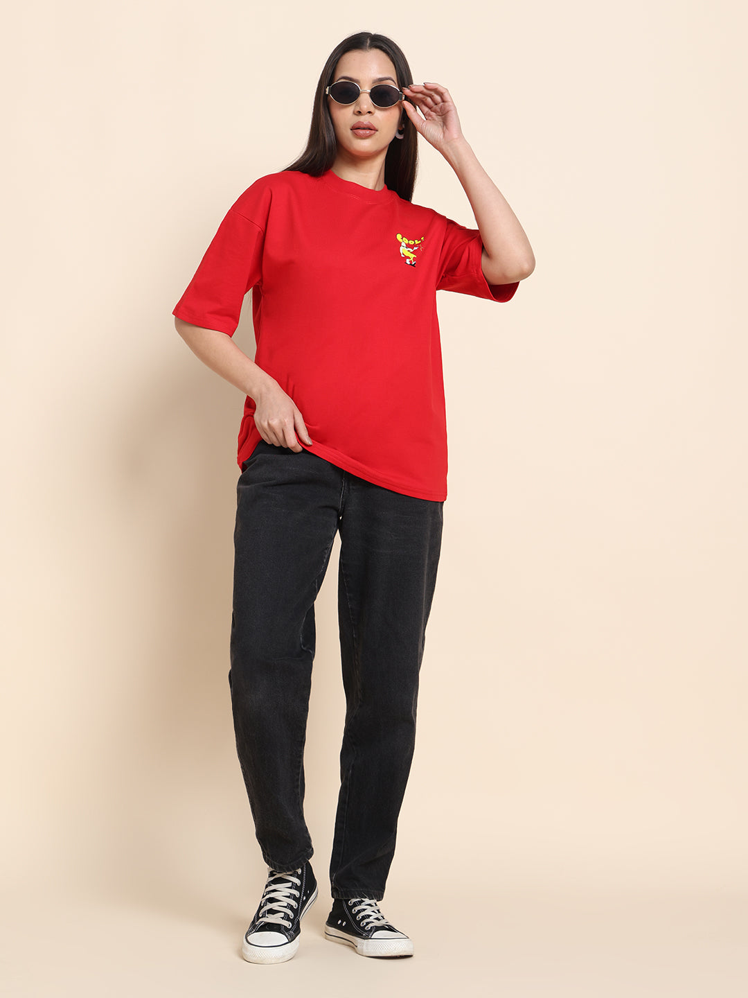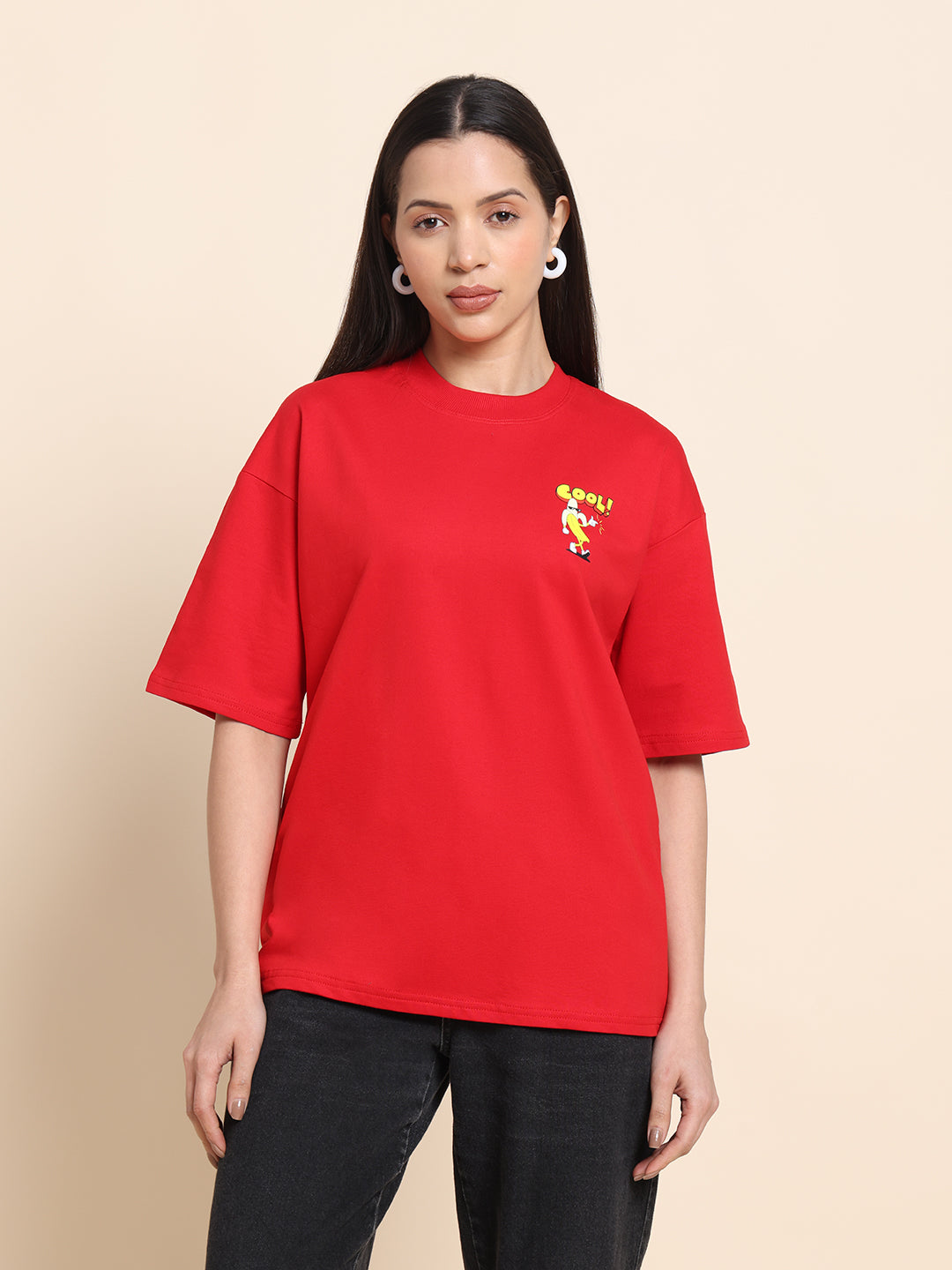 Stay effortlessly stylish and comfortable with this oversized French Terry cotton T-shirt for women. Designed for a relaxed fit, this bold red tee features a trendy "COOL!" print with a quirky banana graphic, adding a playful touch to your wardrobe.